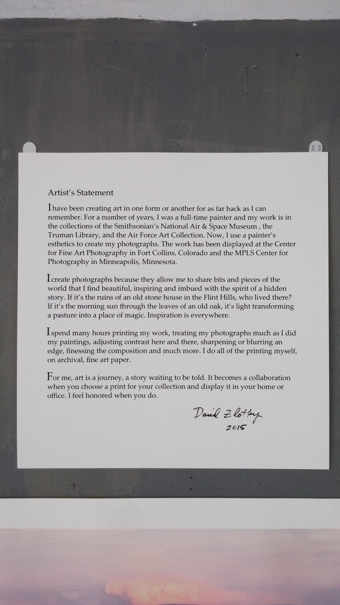 David Zlotky is a painter and photographer whose work is in the collections of the Smithsonian Institution’s National Air & Space Museum, the Truman Library in Independence, Missouri and the U.S. Air Force Art Collection. His photographs have been exhibited at the MPLS Photography Center in Minneapolis, Minnesota, and his image, Morning Light, was recently selected for a show at the Center for Fine Art Photography in Fort Collins, Colorado.
