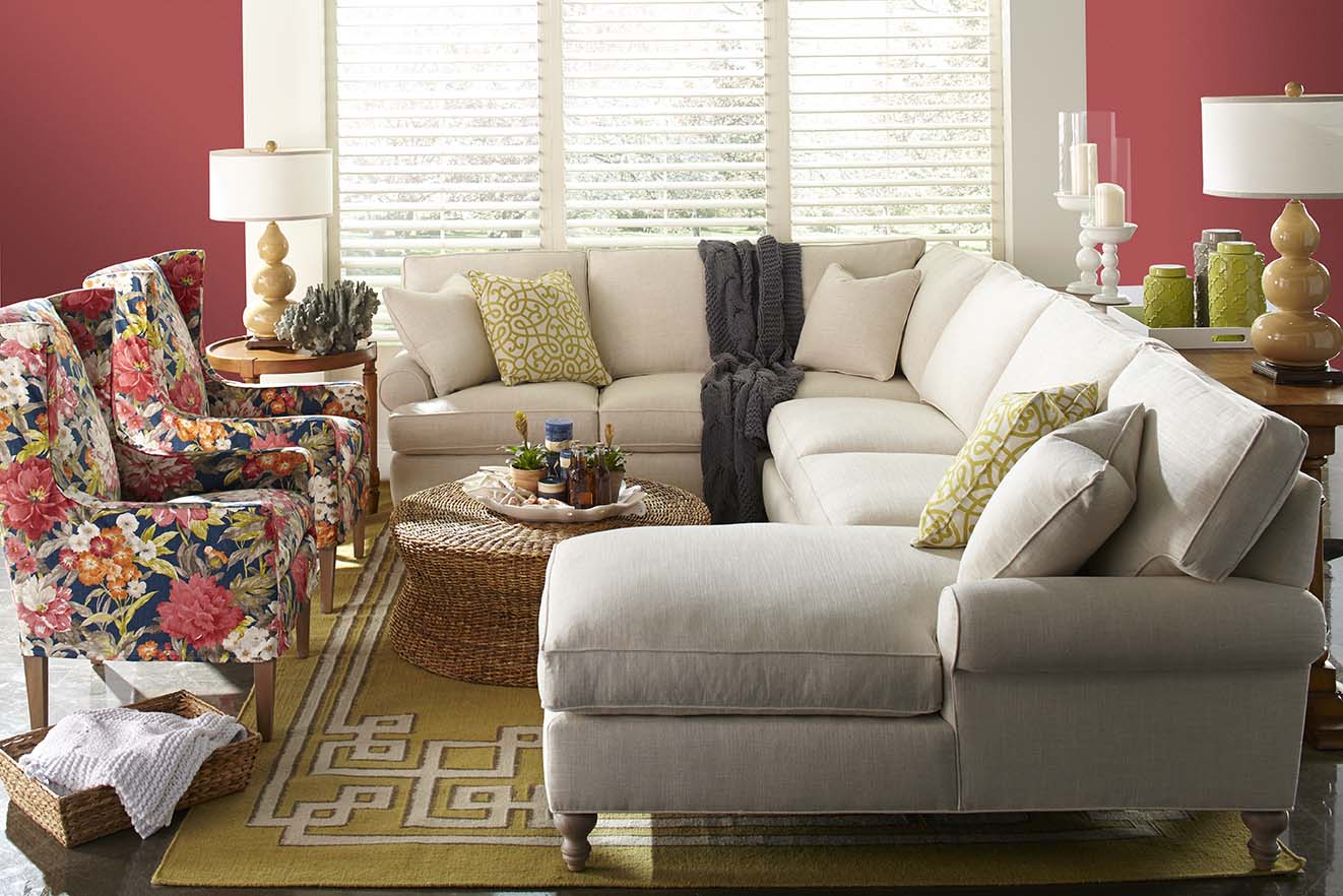 Interior design is all about the relationships that happen within a space. Warm tones on wall and floor engage us with enthusiasm for hospitality and compassion. Slow motion sinking into feather down cushions means rich time spent compadres; the feature comes standard in this Cindy sectional by Robin Bruce. Lots of natural light and natural elements brought in through ottoman, throw and accessories enlivens the setting with clarity and curiosity.