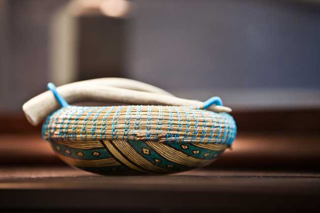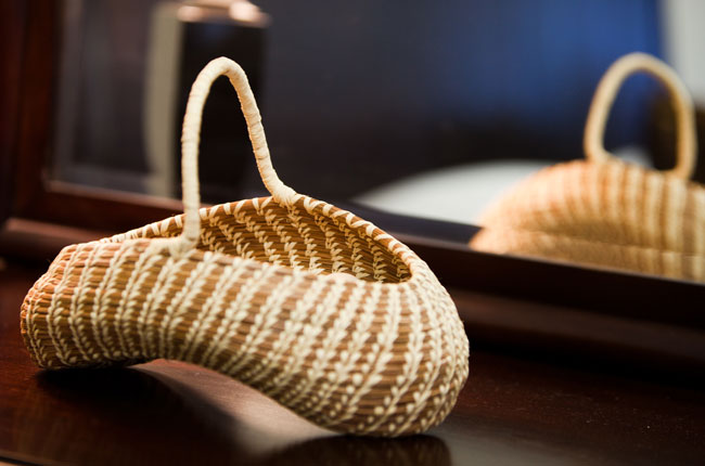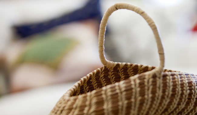 Soho Interiors is privileged to feature hand crafted pine needle baskets by Anne Wells. Wells’ inspiration came after moving to a home in California, where a tree shed needles all over her deck; she purchased a book and taught herself the art of basket weaving. Anne transposed the book’s instructions from right handed to left handed and has continued to increase the complexity of designs over the years. Canary Island and Montezuma pine needles are her choice material as they are very flexible and measure from 9-15 inches long. Come admire a variety of baskets–some coiled with raffia, some with waxed thread, two with gourd bases. Private collection – not for sale.